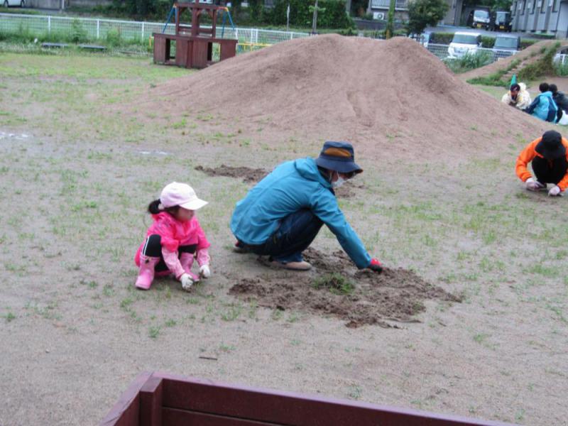 7月8日(土)。天気はあいにくの雨…。それでも子どもたちと保護者の方が集まってくれました。本当にありがとうございます!悪天候だったせいで当日は少数精鋭でしたが、実は総勢50名ほどの参加申し込みがありました。園に関心を寄せていただいて嬉しい限りです!ぜひ次回(運動会前)もお願い致します。 雨で地面が柔らかくなったおかげで草はスイスイと抜けていきます。園庭には色とりどりのカッパが点在しています。親子で黙々と草むしりする姿もあれば、保育園や家庭でのお子さんの話に花が咲いたり、小学生のお兄さんお姉さんははりきってあちらこちらの草をむしり、ベテランの草むしり名人は跡形もなく草を抜き払い、草刈り機のお父さんたちはあっという間に刈り倒し、園庭はとてもきれいになりました。 そのあとは、6月の園庭整備で保護者の方と一緒に作ったウッドデッキを職員のみで作りました!インパクトドライバー初体験の職員が多かったのですが、なんとまあ上手なこと!「はっ!」「よっ!」「ナイス―!」と口の回転も軽やかに、4台のウッドデッキをこしらえました!これで乳児テラスのウッドデッキが全面開通しました。このデッキは、乳児の子たちがのびのびあそべるようになっただけでなく、乳児と幼児の交流の場としての機能も持ち合わせていて、素敵な空間になりました!