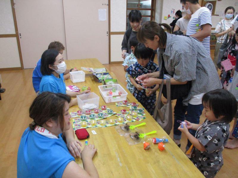 7月28日(金)3年ぶりに制限なしの夏まつりを開催しました。ご近所の方や卒園児の皆さんも来てくださり、にぎやかにスタートしました。子どもたちの一番人気はピカピカおもちゃです。卒園児や兄弟の子もワニワニパニックで張り切って遊んだり、缶積みを崩さないよう慎重に積んで楽しんでました。出店の後は、年長組さんが作った「おじぞうさまみこし」を元気いっぱい担ぎ、年中組さんも手作り団扇をもって応援しながら練り歩いてきました。最後は盆踊りを全員で踊りました。