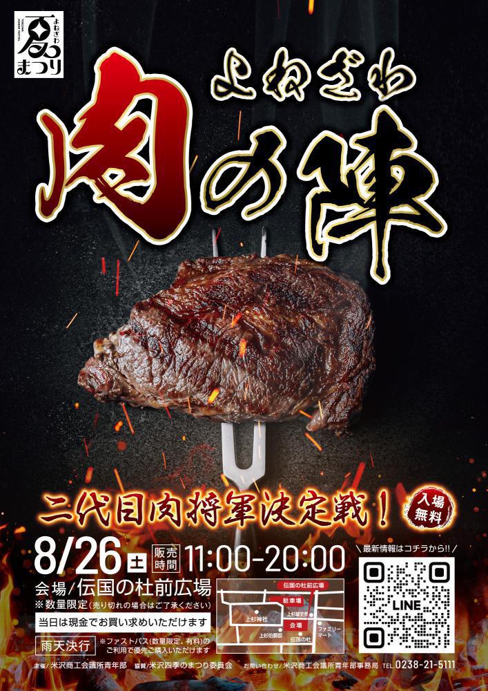 Are you ready to chow down on some meat? Head on over to Denkoku no Mori for this year's Nikunojin on 26th August and brace yourself for an assortment of meat dishes! Beef and pork won't be all that's there, you can also expect chicken, mutton, horse, and game meat! You can also vote for this year's Meat Shogun on site if you so wish! Date: 26th August 2023 (Saturday)Time: 11:00 am ~ 8:00 pm* Please take note that stock can sell out before 8:00 pm. Venue: Denkoku no Mori open area* The event will proceed even if it rains. Fast PassSkip the queue with the Fast Pass! Each ticket costs 500 yen and can only be used at one store to purchase up to 2 items on the menu. Please note that this is a separate charge from the food itself.Fast Passes can be purchased at the Young Entrepreneurs Group booth. Shuttle Bus InformationShuttle buses will be available to ferry passengers to and fro Yonezawa City Hall and Denkoku no Mori. The first bus leaving City Hall departs at 10:30 am, while the last bus departs at 7:30 pm.The first bus leaving Denkoku no Mori departs at 11:30 am, while the last bus departs at 8:30 pm. Notes- Please pay by cash.- Entry is free. ContactYonezawa Chamber of Commerce and Industry Youth SectionTEL: 0238-21-5111 WebsiteInstagramFacebook
