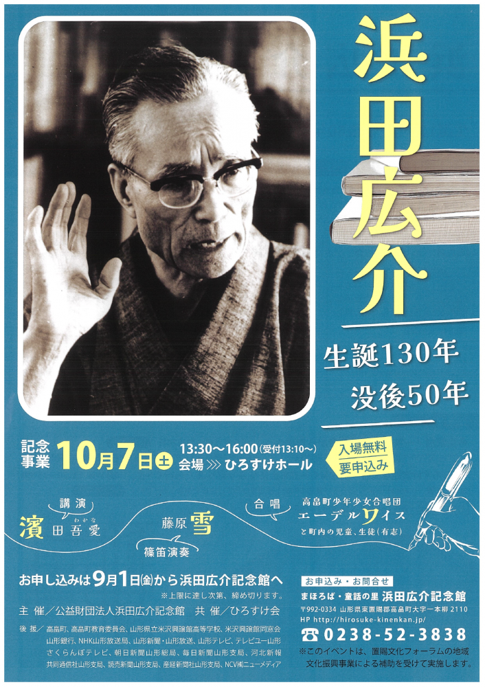 浜田広介生誕130年・没後50年記念企画として、浜田広介記念館にて、浜田広介の孫である浜田吾愛氏(東京藝術大学非常勤講師)が祖父・広介とのエピソードを語る講演や、上山市出身の篠笛・フルート奏者、藤原雪による「泣いた赤おに」をイメージした篠笛演奏会等を行います。講演などを通じて、浜田広介の人物像に迫り、ひろすけ童話やひろすけ童謡への理解を深める内容となっております。ぜひ、ご来場ください。開催日時:令和5年10月7日(土)13:30〜(受付13:10〜)場所:浜田広介記念館ひろすけホール料金:入場無料 ※事前申込みが必要です。申込みは9月1日より浜田広介記念館にて 受け付けます。お問い合わせ:浜田広介記念館(0238-52-3838)詳細はコチラ
