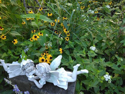 暑い日が続きますが、朝晩は少し涼しくなってきて秋の気配もちょっぴりと・・・日も短くなってきましたね。 朝の日課、庭をぐるっと〜朝の爽やかな一時、エンゼルたちが何か楽しくつぶやいているようで、ほっこり〜↓後ろはルドべキア・タカオと今年の新人のグラスで満杯に!秋を感じる風景です。 ↓まだ朝の涼しい時間なので、イイ感じデス。朝限定ですね! この暑い時期に狂い咲きの”ボケ“ 予報で雨マーク出るも雨は全然降ってくれません・・・もう花達も限界、もちろん人も限界ですよね。