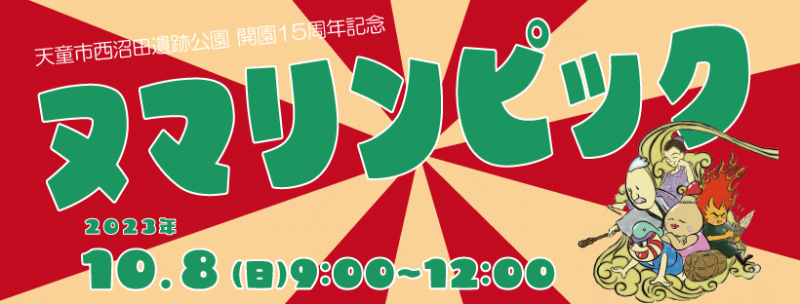 年に一度のスペシャルイベント!天童市西沼田遺跡公園 開園15周年記念ヌマリンピック日時:令和5年10月8日(日)9:00〜12:00内容:古代競技5種、古代人をさがせ!、西沼田サポネット100円フリマ、ぬまりん館展示室無料開放、復元住居でおやつ焼き、キッチンカーによる食べ物販売 参加無料・申し込み不要ーーーーーーーーーーーーーーーーーーーーーーーーーーーーーーーーーーーーーーーーーーヌマリンピックとは?むかーし、むかし。それは1500年も前のこと。米作りをして暮らす小さなムラがありました。季節は秋――田植えから大事にイネを育ててきた田んぼには、たわわに実った稲穂がキラキラと輝いています。「今年もたくさんの米がとれた。これも神さまのおかげじゃ!」稲刈りを終えたムラの人々は、田んぼの神さまに感謝する"おまつり"を始めました。それは、近くのムラ、遠くのムラからも「力じまん」「足じまん」が集まる大運動会だったのです! ヌマリンピックの競技とは?これまでに登場した競技は8種目。稲杭投げ、弓名人、丸太わたり、かけっこ、たらばす投げ、古代孔球、なわ投げ、田力競走、どれも西沼田遺跡公園オリジナルの競技です。ヌマリンピック当日は、公園全体が競技会場。毎年、各種目各部門で優勝者を決定します。なんと今年は開園15周年を記念して新競技が2つ加わり、合わせて10種目となりました。 今年の競技種目は?古代競技5種 古代競技から選りすぐりの5種目を実施します1.弓名人狩りの道具、弓矢で獲物の的をねらいます。最も遠いタカの的は、20m先の50点!これを仕留めれば優勝間違いなし!?2.たらばす投げ(たらばす=米俵のふた)をフリスビーのように投げてカゴに入れば得点。全部で5投します。3.丸太わたり丸太の橋を落ちないように進みます。時間ぴったりで渡り切った人が優勝!バランスとタイム、感覚を研ぎ澄まして進め!4.古代蹴球(しゅうきゅう)NEW!古代孔球をリニューアル!前方後円墳の中心をねらってボールを蹴ろう。5球の合計点で競います。5.??? NEW! 古代競技初の頭脳プレーで競います。 その真相は…当日までのお楽しみ。♪豪華賞品もりだくさん♪○各種目、大人の部と子どもの部に分けて優勝者を決定します。今年の優勝賞品は「はにわトロフィー」!結果は後日ホームページで発表します。○全種目に挑戦した方の中から抽選で20名に賞品をプレゼントします。○3種目以上に挑戦した方に当日受付にて記念品をプレゼントします。古代競技の他にも…◆古代人をさがせ! 古代人をさがし出してミッションをクリアしよう◆ぬまりん館展示室無料開放 展示室入館料が本日限り無料に!1500年前のムラの暮らしをのぞいてみよう◆キッチンカー たこ焼きや玉こんにゃくの販売 (〜13:00)◆西沼田サポネット100円フリマ 雑貨、農産物、どれでも100円(〜13:00)◆復元住居でおやつ焼き 人気のおやつ焼きがついに復活!マシュマロをいろり火で焼いて食べよう  チラシのダウンロードはコチラ(PDF) お問合せーーーーーーーーーーーーーーーーーーーーーーーー天童市西沼田遺跡公園рO23−654−7360月曜休園(祝日の場合は翌日) 9:30〜18:00