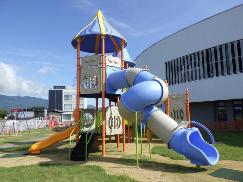 長井市の複合施設としてオープンする「くるんと」明日9月1日にグランドオープンです!工事部では、施設の裏側に遊具工事をさせて頂き完成しています。遊具は鉄の部分が多いので今の季節触ると熱いかも_皆さん安全に遊んでくださいね〜〜〜〜
