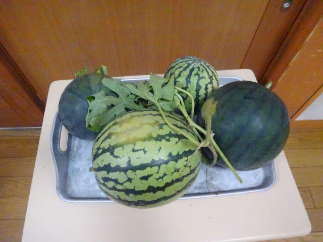 園庭の畑で育てていた小玉スイカが実り、割ってみることに!重たいね、何色かな〜?と、保育者が半分に切ると、「あか!あか!きいろだー!」と大盛り上がり。その後は、大きなスイカでスイカ割りをしました。新聞紙棒を使って「えいっ!」「そーれ!」と掛け声をかけながら、力いっぱいスイカをたたく子どもたち。「なかなか割れないなぁ〜」と。最後は保育者も一緒にすると、パッカーン!!!と2つに割れて、「やったー!」と歓声が上がりました。その場で切り分けて、みんなで味わいました
