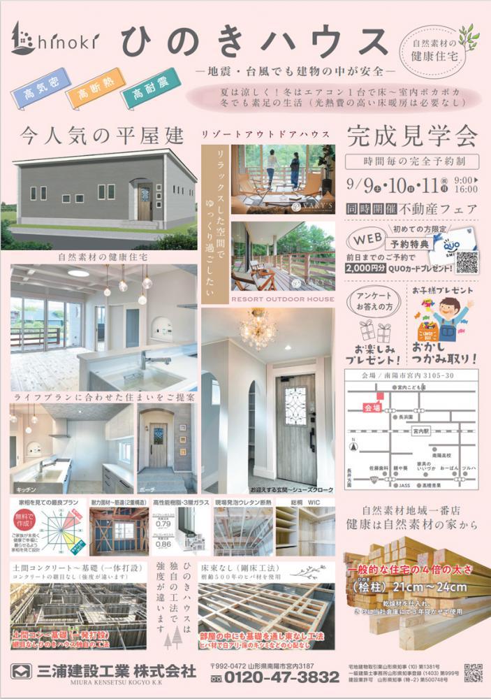 残暑の候皆様におかれましては、益々ご清祥の事とお喜び申し上げます。さて、弊社ではこの度、施主様のご厚意により、夏涼しく、冬温かい『ひのきハウス』の完成見学会を開催いたします。今年こそはマイホーム取得、リフォームをお考えの方、土地をお探しの方、土地・建物の事はぜひ、弊社にお任せください。 ●日 時:9月9日(土)、10日(日)、11日(月) 9:00〜16:00 ※完全予約制となりますので、予めご連絡お願いいたします。 ●会 場:南陽市宮内3105-30 ●来場者得点:お楽しみプレゼント、お菓子のつかみ取り ●ご連絡先 :0120−47−3832 三浦建設工業スタッフ一同、皆様のお越しを心よりお待ちしております。