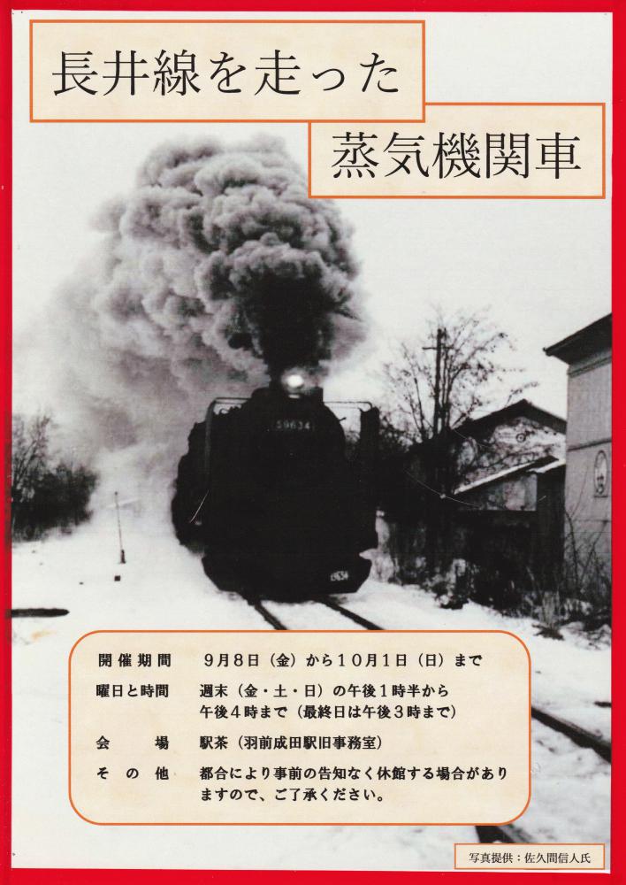 9月になりました。駅茶は、1週間のお休みを頂きましたが、それでもまだ猛暑の疲れは取れていないように感じます。皆さんは如何でしょうか? 秋期展示のスタートは、「長井線を走った蒸気機関車」です。長井線開業当時の機関車や車両、86型やさよなら列車となった59634号の貴重な写真を展示します。どうぞご覧ください。 開催期間は、9月8日(金)から10月1日(日)までの週末(金・土・日)の午後1時半から4時まで。最終日は午後3時終了です。なお、都合により事前の告知なく休館とする場合がございますので、ご了承ください。
