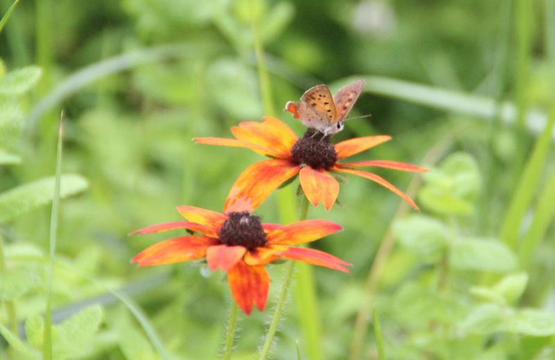 ●道路わきの空き地にオレンジ色の花にとまっている小さな蝶を見つけました 欲張りに花と蝶をとりましたが「ルドベキア」という花と「ベニシジミ」という蝶でしょうか ネットによると「ルドベキア」は黄色い花を咲かせるとありましたのでもしかすると違った植物かもしれません 花も蝶も秋色を感じさせてくれる色です 涼しい朝でいよいよ秋本番となりました