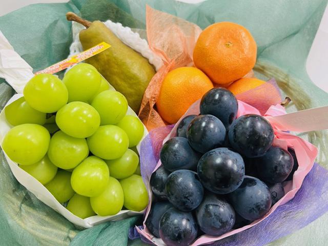 ぶどうの季節です。贈り物に、お供えに、フルーツギフトの主役は皮ごと食べられる大粒のぶどう「シャインマスカット」「ナガノパープル」になります。洋梨「オーロラ」・ハウスみかんが彩りを添えます♪※9月上旬/8,000円~9,000円(税込)のご予算でフルーツの詰め合わせは店頭にて承ります。お電話またはお問い合わせ窓口からもお気軽にお申しつけ下さいませ。