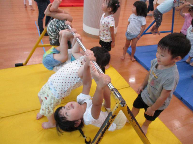講師の先生がいらしての体育あそびは初めての乳児組さん。少し緊張していた子もいましたが動き始めると楽しくて思い切り身体を使って遊んでいました。鉄棒でのぶら下りや、巧技台のはしご渡りで講師の先生から「いいね〜」「すごいね」と言葉をかけていただくと、それが嬉しくて自信になり更に張りきっていました。最後は「またきてね〜」とハイタッチをしている子もいました。