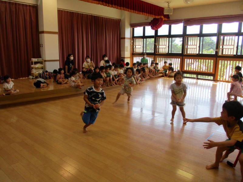 8月24日「安田式体育あそび」の講師の先生をお招きし、様々な用具と身体を使ってのあそびを教えていただきました。年少組さんは初め緊張した表情の子もいましたが、年中、年長さんが楽しそうに走ったり、かっこよく平均台の忍者飛びをする姿を見ると、「やりたい!」気持ちがわいてきました。みんなで環状線リレーをすると、楽しくて次の人に変わるのも忘れて2周、3周とニコニコしながら走っている年少さんが微笑ましかったです。