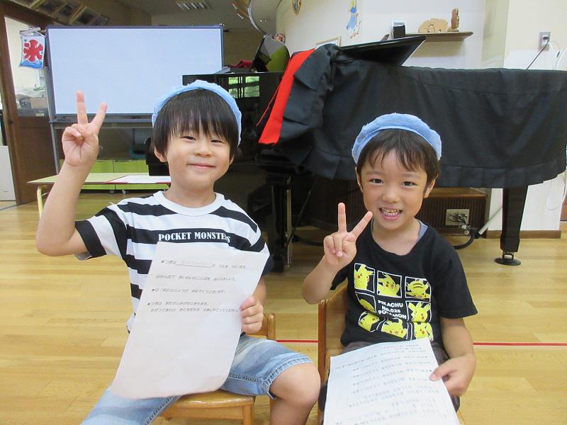 8月生まれの5名のお友だちがちょっぴりドキドキしながらも、嬉しそうに入場しました。乳児組のお友だちは、つかまり立ちやジャンプ、幼児組のお友だちは、描いた絵を見せてくれたり鉄棒を披露するなどして、一人ひとりの得意なことを発表してくれました。保育者のお楽しみの前に、保育まつりで踊る『クラップダンス』と『きつねダンス』を年長組さんの女の子が踊って見せてくれました。見ていたお友だちも一緒に真似っこしてダンスし盛り上がりました♪保育者のお楽しみは『かき氷屋さん』です。幼児組の誕生児のお友だちにも手伝ってもらい、透明な水が、あっという間に色とりどりのかき氷シロップに変身!この時期に登場する動物や鳥、魚さんたちにかき氷のプレゼントをしました。最後は、お友だちみんなにもおすそ分けし楽しみました。