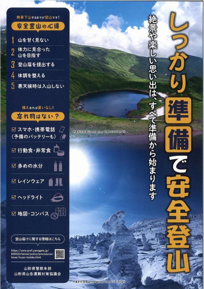 絶景や楽しい思い出は、すべて準備から始まります。安全登山の心得、笑顔で帰宅するためのルールを参考に山の事故を防いで楽しく登りましょう! 安全登山の心得!1. 山を甘く見ない2.体力に見合った山を目指す3.登山届を提出する4.体調を整える5.悪天候時は入山しない 笑顔で帰るためのルール!・登山計画を必ず立て、登山届を提出しましょう。家族等にも知らせましょう。・事前トレーニングを行い、体力、技術にあった無理のない登山をしましょう。・こまめに水分、塩分等を補給しましょう。・天候の急変に備えましょう。(レインウエア、予備の食料・飲料、携帯電話、予備電池、地図、コンパス、ヘルメット等)・クマとの遭遇に気を付けましょう。(ラジオ、クマ鈴)・気象情報、火山情報は、登山中もこまめにチェックしましょう。・携帯電話のGPSは、入山前にオンにしましょう。・道に迷ったら、来た道を戻りましょう。電波の通じる所、見晴らしの良い所で助けを呼びましょう。 ※登山届は山形県警察本部ホームページから