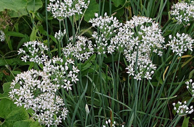 ●伸びた茎の先に小さな星をいくつもちりばめたような可愛い白い花を咲かせる「ニラ」の花があちこちに咲いており 夏から秋の季節の移ろいを感じさせてくれます ネギのような丸いつぼみから花を咲かせますが群生すると小さいながらも華やかに見えます 収穫前の田んぼの黄色い稲とのコントラストが映えます 茎を折ってみると「ニラ」の匂いし 思ったりよりもほのかに甘い香りがします