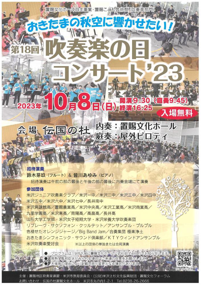 伝国の杜置賜文化ホールにて、第18回吹奏楽の日コンサートが開催されます。今年は、ホール内の内奏だけでなく、屋外ピロティでの庭奏も行われ、大小さまざまな編成のバンドが次々に登場します!ぜひ、ご来場ください!<開催日時>令和5年10月8日(日)9:30開演(庭奏9:45) 16:25終演<場所>伝国の杜置賜文化ホール<料金>無料お問い合わせ先伝国の杜置賜文化ホール(0238-26-2666)詳細はコチラ