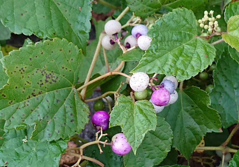 ●草やぶや道路そばで背丈の高い草や木につるがぶら下がるよう生えている「ノブドウ」をよく見かけます 花は黄緑色で地味ですが今頃になると白やピンク 水色 青緑色 紫色などとてもカラフルな実をつけます 今はまだ白い実が多いのですがようやく色づいてきました このカラフルな色の実ですが実の中に小さなハエの幼虫が入り込むことが多く食べられないそうです 昔から有毒といわれていますが有毒かどうか不明だそうです