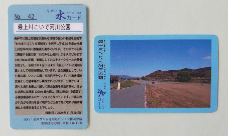 NO42は「最上川こいで河川公園」です。野川まなび館を利用した方展示室を見学した方への記念品として無料で配布しております。ご希望の方は、事務所までお声がけください。※発行年度内は、無料で配布しています。次年度からは50円の協力金を頂いています。※郵送による配布は受け付けておりませんのでご了承ください。発行 長井ダム水源地域ビジョン推進会議