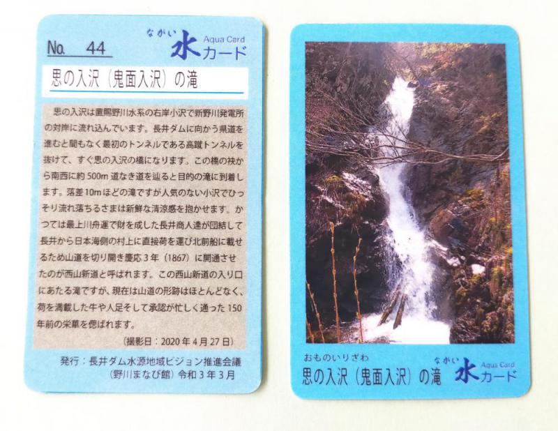 NO44は「思の入沢(鬼面入沢)の滝」です。野川まなび館を利用した方、展示室を見学した方への記念品として無料で配布しています。ご希望の方は、事務所までお声がけください。※発行年度内は無料で配布しています。次年度からは50円の協力金を頂いています。※郵送による配布は受け付けておりませんのでご了承ください。発行 長井ダム水源地域ビジョン推進会議