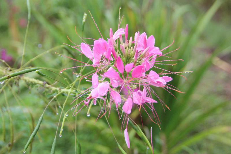 ●「セイヨウフウチョウソウ」または「クレオメ」で1年草ですが属名の「Cleome]が由来になっていて「クレオメソウ」とも呼ばれているそうです おしべが花より長くとび出る特徴的な花を咲かせ 花は短命で2日ぐらいで散りますが次々と新しい花が先端から開花し 7月頃から10月まで長期にわたって咲き続けるそうです 秋の色よりはピンクの春の色のような花ですねえ
