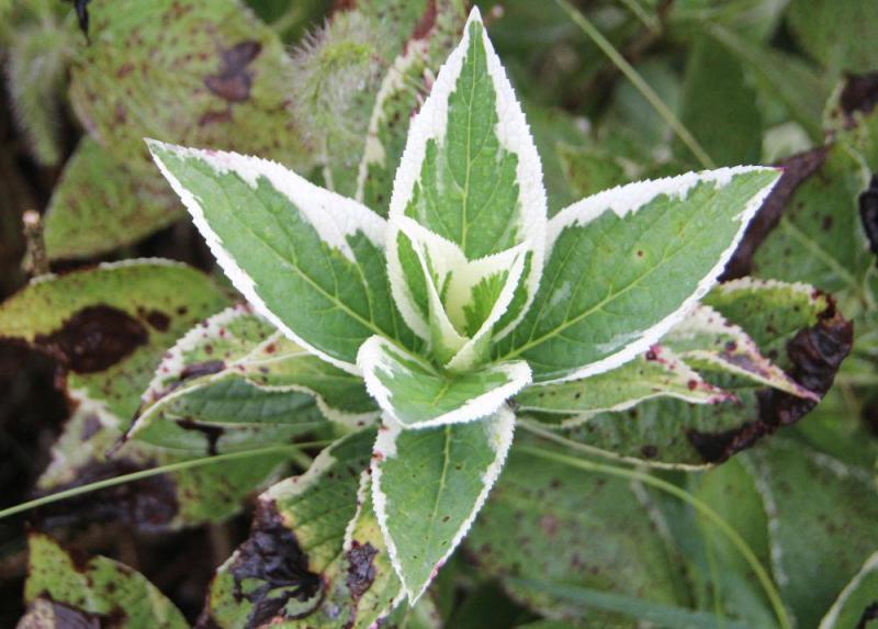●暑いと思っていたのにあっという間に涼しくなってきました 暑くて芽を出せなかった「アジサイ」の枯れた葉のついた木の先端からが爽やかな緑に白い斑入りの葉がでていました 「アジサイ」の葉でしょうか 冷たい雨に打たれて少し涼し気ですが秋にこんな葉を見せてくれる花木はなんという木でしょうか