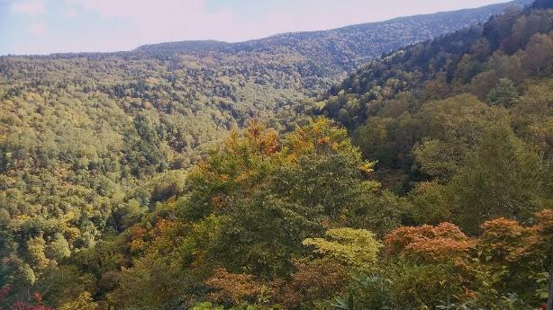 昨日の天元台高原、第二リフト乗り場の左側に希望の鐘があり、その上に中吾妻展望台があります、そこから中吾妻を見上げて眼下には、明道沢と明道の滝を見ることができます・・この展望台が標高1450mでこの付近が紅葉見ごろとなりました・・第三リフトの降り場付近1820mのダケカンバは葉を落としてきましたね・・紅葉もまもなく天元台高原駅1350m付近まで下がってきますね・・次の休み16日に紅葉と山ブドウ、キノコ採り兼ねてきてみようと思います・・天気が良ければいいけども・・