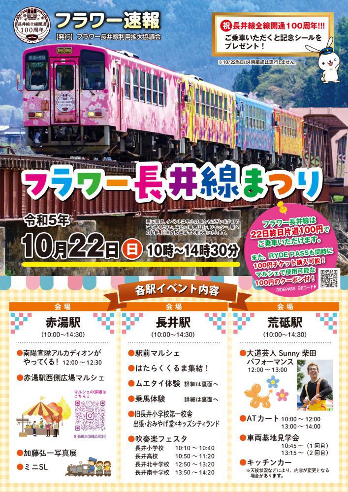 10月22日(日)『フラワー長井線まつり2023』開催!!10:00 〜 14:30・詳しくはこちら(山形鉄道HP)・フラワー長井線まつり2023(PDF)はこちら フラワー長井線は22日終日片道100円でご乗車いただけます。この機会にぜひご利用ください。また、RYDE PASSも同時に100円チケット購入可能!マルシェで使用可能な100円のクーポン付! ■長井線全線開通100周年!!!ご乗車いただくと記念シールをプレゼント! 長井線全線開通100周年イベント情報については、こちらのページをご覧ください。 各駅イベント内容 ■赤湯駅(10:00 〜 14:30) ・南陽宣隊アルカディオンがやってくる!(12:00 〜 12:30) ・赤湯駅西側広場マルシェ ・加藤弘一写真展 ・ミニSL ■長井駅(10:00 〜 14:30) ・駅前マルシェ ・はたらくくるま集結! ・ムエタイ体験 ・乗馬体験 ・旧長井小学校第一校舎 出張・おみやげ堂×キッズシティランド ・吹奏楽フェスタ 長井小学校 10:10 〜 10:40 長井高校 10:50 〜 11:20 長井北中学校 12:50 〜 13:20 長井南中学校 13:50 〜 14:20 ■荒砥駅(10:00 〜 14:30) ・大道芸人Sunny柴田 パフォーマンス 12:00 〜 13:00 ・ATカート 10:00 〜 12:00、13:00 〜 14:00 ・車両基地見学会《各回40名定員》 10:45 〜(1回目)、13:15 〜(2回目) ・ATカート体験乗車 ・キッチンカー 同時開催■羽前成田駅(10:00 〜 14:30) ●芋煮会(11:00 〜) ・オカリナ演奏会(11:15 〜) ●米屋こうじと長井高校写真部合同展示会 期間:10月6日(金)から10月22日(日)まで 時間:期間週末(金・土・日)の13:30 〜 16:00《22日は10:00 〜 14:30》 ■西大塚駅まつり(10:00 〜 14:30) ●写真・絵画・書道・川柳展示 ●地元有志による飲食店 ●音楽会 ■加藤弘一・鈴木亮写真展〜 長井線全線開通100周年 フラワー長井線の魅力 〜 期間:10月9日(月)から10月15日(日)まで 時間:10:00 〜 17:00《15日は16:00まで》 会場:ギャラリー停車場 (旧長井小学校第一校舎) 100周年記念クイズラリー!! 赤湯駅、西大塚駅、長井駅、羽前成田駅、荒砥駅の5駅合同でクイズラリーを開催いたします! クイズをクリアすると缶バッチをプレゼント!(各駅先着100 名) 長井線に手を振ろう! 全線開通100周年を記念したヘッドマーク車両が運行します! 各会場を通過するときに、皆さんで駅のホームから手を振ってお出迎えをしましょう! 運行時間:荒砥駅発10:23 –> 赤湯駅着11:29 高校生マーケティングプロジェクト〜 探究型学習を通した若者定着の取り組み 〜 置賜地域の高校生がマーケティング等の実践的なスキルを学び、フラワー長井線の新たな客層開拓に向け7 月から取り組みを行ってきました。長井線まつり当日に成果発表を行いますので、是非ご覧ください!