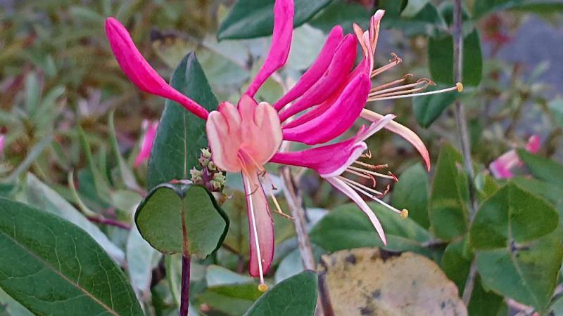 いつもの訪問者から次のように名前を教えていただきました 適切なご指導ありがとうございます【今日のお花を見せていただきました ヨーロッパの「ハニーサックルピンク」と思われます 「ニオイニンドウ」もヨーロッパのスイカズラです 日本のスイカズラと同じ時期に咲くようなのでシーズンがずれてしまった開花と思います 季節の変化に花たちも惑わされているかのようですね】