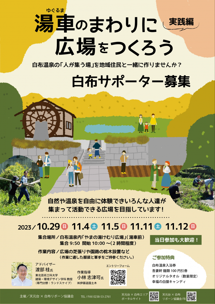 天元台×白布リボーン協議会では、白布温泉エリアの新たなシンボルとして湯車を設置しております。自然や温泉を自由に体験でき、いろんな人達が集まって活動できる広場を目指しています!白布温泉の「人が集う場」を地域住民と一緒に作りませんか?当日参加も大歓迎!ご都合の良い日程で、ぜご参加ください! 【開催日】10月29日(日)・11月4日(土)・11月5日(日) 11月11日(土)・11月12日(日) 【集合場所】白布温泉内「やまの湯けむり広場」(湯車前) 集合9:50 開始10:00〜(2時間程度)※遅れてのご参加もOKです。 【作業内容】広場の芝張りや園路の枕木設置など※作業に適した服装と軍手をご持参ください。 【参加申し込み】当日受付だけでも参加可能ですが、おおよその人数把握が必要なため、エントリーのご協力よろしくお願いいたします。エントリーフォームはチラシから 【参加特典】・白布温泉入浴券・吾妻軒 麺類100円引券・オリジナルタオル(数量限定)・幸福の白猿キャンディ 【お問い合わせ】天元台×白布リボーン協議会TEL:0238-53-2761
