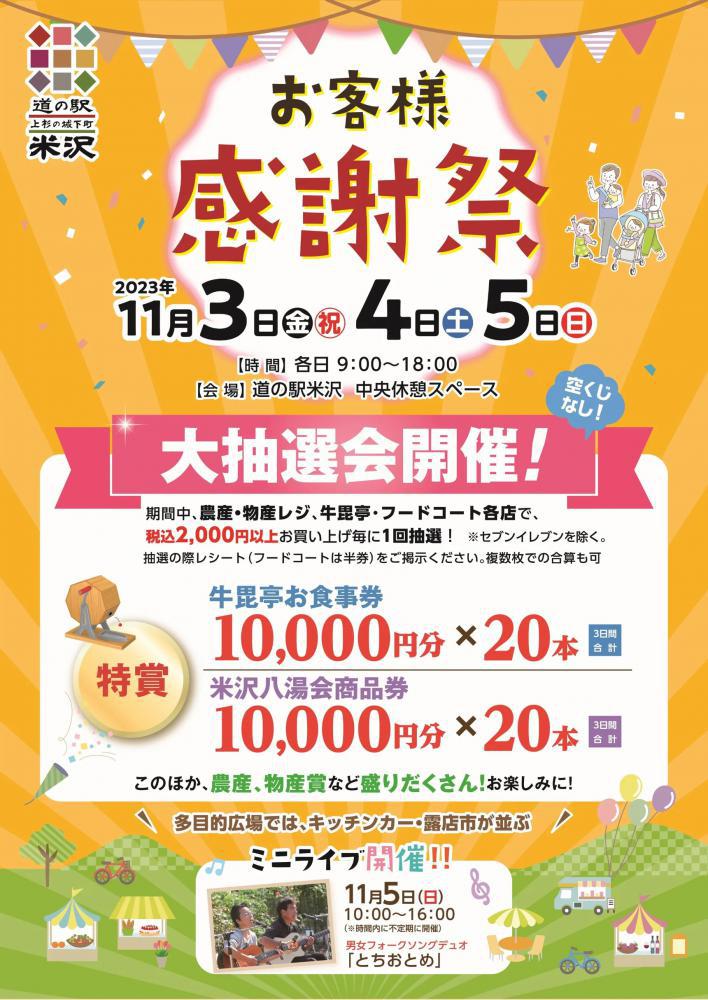道の駅米沢では、11月3日(金)〜5日(日)に「お客様感謝祭」を開催します!期間中、農産・物産レジ、牛毘亭、フードコート各店で税込2,000円以上お買い上げ毎に1回抽選することができる空くじなしの『大抽選会』を開催!(セブンイレブンを除く)牛毘亭のお食事券10,000円分や、米沢八湯会商品券10,000円分など豪華な賞品が盛りだくさん!また、多目的広場では露店市やキッチンカーが並び、フォークソングデュオ「とちおとめ」ミニライブ(5日のみ10:00〜16:00で不定期に演奏)も開催!みなさん、ぜひお越しください! ◇開催日時 2023年11月3日(金・祝)〜5日(日) 9:00〜18:00 ◇会場 道の駅米沢 中央休憩スペース 多目的広場 ※抽選の際はレシート(フードサービスは半券)をご提示ください。 ◇お問い合わせ 道の駅米沢 〒992-0117 山形県米沢市川井1039-1 TEL:0238-40-8400