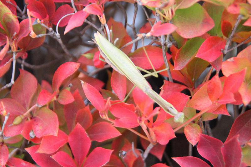 ●ドウタンの紅い葉にとまり日向ぼっこをしている「カマキリ」を見つけました 秋になると「カマキリ」が目立つようになりますが数が増えるのではなく目につくようになるからだそうです 俳句の秋の季語の一つに「カマキリ」があるのは秋になるとよく目にするようになるからだそうです 秋に卵を産み卵で冬を越し翌春にふ化し何度かの脱皮を繰り返し成虫となるのだそうです 他にも不思議な生態があるのが「カマキリ」です