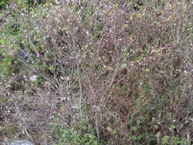 昨日、西山に初雪が降った。駅の雪囲いと電飾の設置作業もそろそろだ。 十月桜は今が満開のようだ。今年は、北側の木がかなり大きな花を付けているように見える。春先に初めて枝の剪定を行ったことが功を奏したのだろうか。 ホームのはずれに立つ2本の十月桜。この場所に、この樹種を選んで植樹した人はどんな人だったのだろうか。 気の付かぬところに十月桜かな(高澤良一)