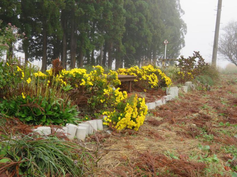 4月から10月まで、毎月の除草作業は大変なものであった。立冬を迎え、その時々を彩った草花が、眠りにつこうとしている。そんな中で、ホーム側の花壇には、菊の花が色鮮やかに咲いている。 この寒さの中にあって、多くの草花の最後を飾るその姿には、凛としたものすら感じる。天皇家の紋章となり、人生の最後を飾る場面に多く供えられる意味もここにあるのかもしれない。 どの駅に降りても菊の花ありぬ(右城暮石)。長井線の各駅の秋の様子はどうなっているのだろうか。