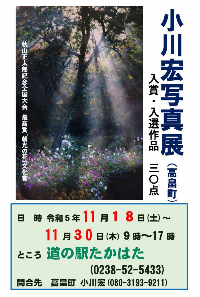 ●知人の紹介で「道の駅たかはた」で行われている「小川宏写真展」を見てきました 人物を被写体にこれまで数々のコンクールで入賞した作品30点ほどが展示されていましたがどれもほっこりするような温かさを感じる写真ばかりでとても気持ちのよい一時をもつことができました 被写体の人物の輝くような顔 見事にフォーカスされた写真 美しい風景などとても良い写真ばかりでした