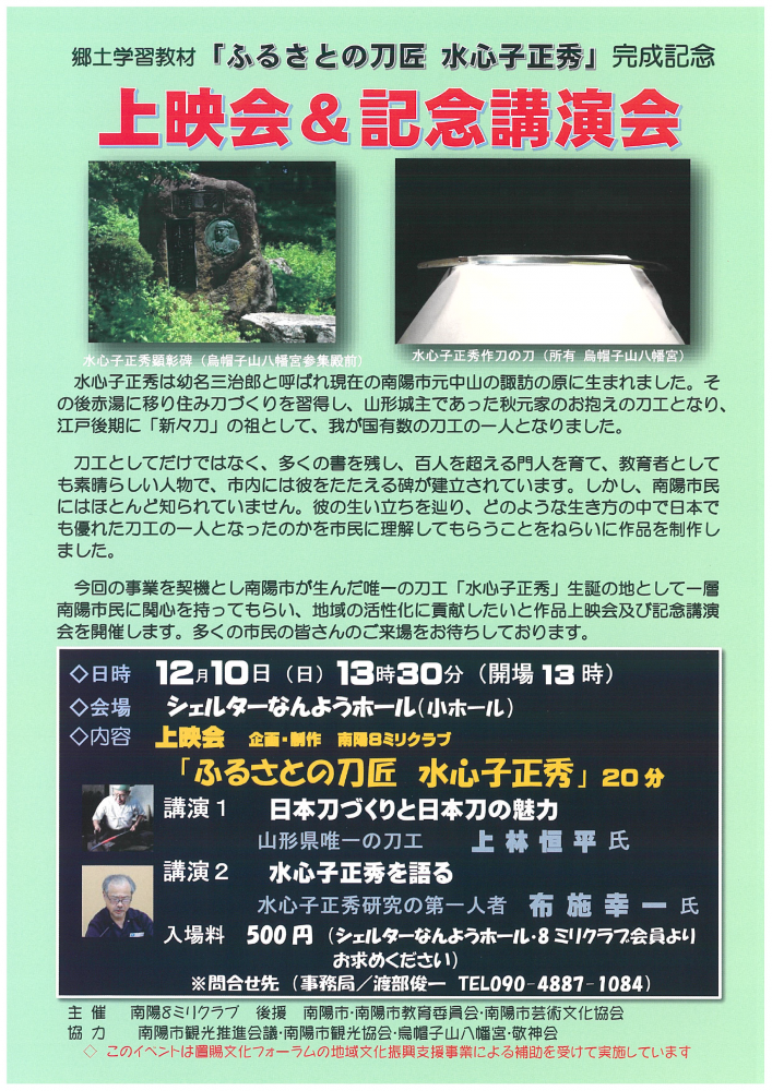 シェルターなんようホール小ホールにて、「郷土学習教材「ふるさとの刀匠 水心子正秀」完成記念上映会&記念講演会」が開催されます。江戸後期に「新々刀」の祖として活躍した南陽市出身の刀匠「水心子正秀」にスポットあてた映像作品の上映や、県内唯一の刀工である上林恒平氏による講演などが行われます。刀に興味のある方は必見の内容となっています!ぜひ、ご来場ください。<開催日時>令和5年12月10日(日) 開演13:30(開場13:00)<場所>シェルターなんよう小ホール<料金>500円<問い合わせ>南陽8ミリクラブTEL:090-4887-1084 詳細はコチラ