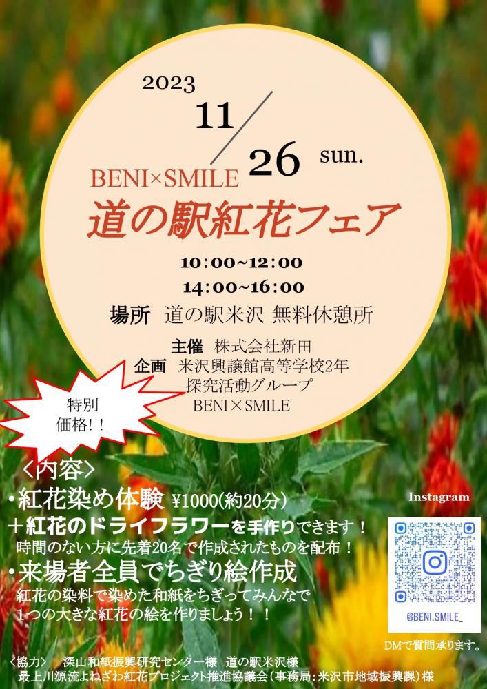 道の駅米沢では、11月26日(日)に「道の駅 紅花フェア」を開催します!紅花染め体験や、来場者全員でちぎり絵作成などイベント盛りだくさん!みなさんのお越しをお待ちしています! 【開催日時】 11月26日(日)10:00〜12:00、14:00〜16:00 【会 場】 道の駅米沢 無料休憩所 【イベント内容】@紅花染め体験(20分) 体験料 1,000円 ※紅花のドライフラワーも手作りできます。 A来場者全員でちぎり絵作成!紅花の染料で染めた和紙をちぎり、一つの大きな紅花の絵を作ります。 【主催】株式会社 新田【企画】山形県立米沢興譲館高等学校2年 探究活動グループ「BENI×SMILE」 【お問い合わせ】道の駅米沢 TEL:0238-40-8400