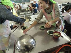 先日5年生が家庭科の調理実習でお味噌汁とおひたしをつくっていました。わざわざ試食にお呼びいただきました。参加した班は「大根と油揚げとネギ」の味噌汁でした。煮干しでだしを取って本格的です。大根はいちょう切りに、ねぎは小口切りと切り方も変えています。煮えにくいものからゆでて出来上がりを揃えます。たくさんの大根と油揚げが入り、具沢山で食べ応えがあります。ほうれん草もちょうどいいゆで加減。一汁一菜見事な食事です。みそ汁の具は班ごとに相談して決めたようで、えのき茸が人気があるようでした。5年生のみなさん、自信を持ってください!とってもおいしかったです。「ハナちゃんのおみそ汁」を思い出しました。PTAの取り組みで、「弁当の日」の取り組みを行っています。本校では12月4日(月)に6年生がお弁当を作ってきます。香川の竹下和男先生が提唱して始めた取り組みです。どんなおかずにする決まったでしょうか。買い物などお家の方々のご協力をお願いいたします。