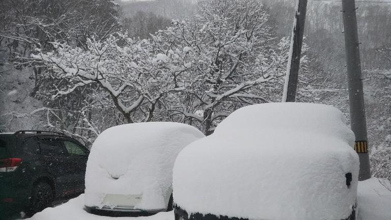 昨日朝、市内に雪降りました・・平地の市内は屋根にあるかないかくらいですが、標高920m天元台高原ロープウエイ麓駅の湯元駐車場は、昨晩から停めてある車はご覧の雪・・何の車かわからんくらいの雪・・お山は本格的な雪となりました・・