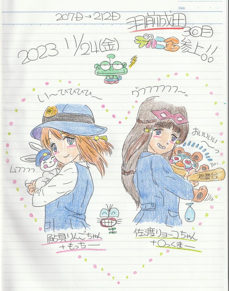デハニ金さんが、またおいでになってくれました。今回は鮎貝りんごさんと佐渡リョーコさんという二人のモデルさんとおいでになりました。もちろんモッチーも一緒です。色鉛筆の柔らかな温かさがいいですね。 でも佐渡リョーコさんはどちらのキャラクターなのでしょうか。○っくまーさんは、デハニ金さんのオリジナルキャラクターなのでしょうか。さらに「デハニ金」さんが正式なお名前で宜しいのかもわからないでいます。 そんな色々なことはさておき、「駅ノートイラスト館」でこれまでの作品も含めてデハニ金さんの世界を楽しんでみてください。 1回目の作品 → 35分の仕事か?:おらだの会 (samidare.jp) 2回目の作品 → 2回目参上:おらだの会 (samidare.jp)