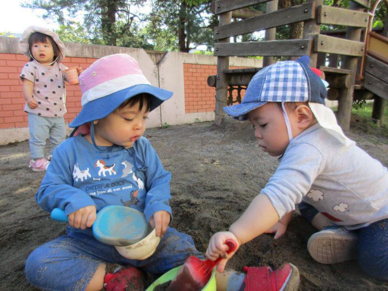 春にはハイハイやお座り、ねんねで遊んでいた子どもたちも、手を繋いで周りの景色に興味を持ちながら散歩をしたり、お友だちと同じ遊びを楽しむ姿が見られるようになってきました。顔を見合わせアイコンタクトで会話をしている姿がとても微笑ましいです。
