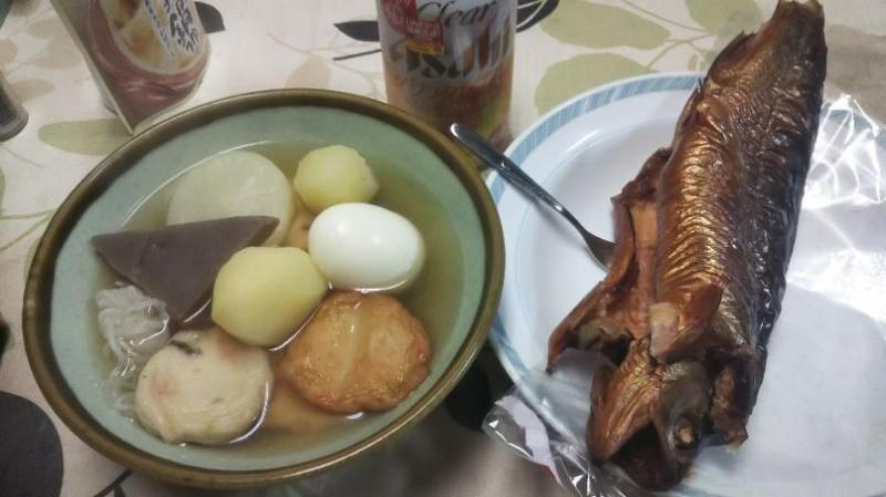 天元台高原のロープウエイ湯元駅と高原駅は、冬になると宿直者を1名ずつおいて、翌日の営業に向け、駅舎の清掃、施設入口などの除雪に、ロープウエイの試運転を行います。ときには高原で急病人など発生した場合に臨時でロープウエイを動かす必要があり、そのための役割もあります。17時で仕事が終わり従業員が湯元に戻ってくると、駅舎は戸締りして、あとは夕飯準備となる・・・自炊するかは自由・・私はメニューが餃子、シチュー、おでん、お好み焼き、たこ焼きだいたいこの繰り返し、そこにたまに釣り好きの人から差し入れがあります、今回はニジマスの燻製でした・・あぶらないでそのまま食べてというんでそのままパクリと行きました・・背のほうはちょうどいい塩加減でよかったけど、腹のほうは身が薄く塩加減が濃かったかな・・以前、生アジをさばいて刺身、塩焼き、フライにしたこともあり。アユの塩焼&寒風干し、ハタハタの丸干しもありました・・いずれも絶品の味・・またアユの寒風干し食べたいなー