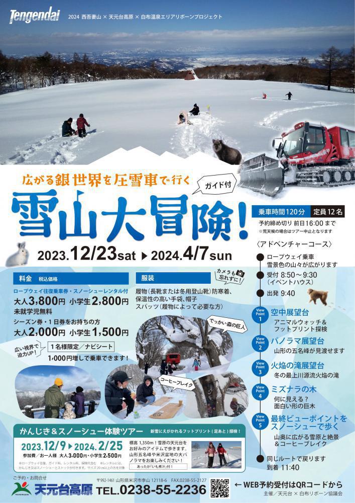 You can sign up to hitch a ride on a snow groomer up in Tengendai Kogen and enjoy a little retreat into a winter wonderland from 23rd December 2023, Saturday! The tour is guided and you might even encounter some of the local wildlife as you admire the surrounding landscape! Lace up your boots and begin your winter adventure! Event Period23rd December 2023 (Saturday) – 7th April 2024 (Sunday) LocationTengendai Kogen Tour Duration120 minutes Participants12 Booking DeadlineThe day before your chosen date, at 4:00 pm.* The tour may be cancelled depending on the weather FeesFee is inclusive of two-way ropeway ticket and snowshoe rentalAdults: 3,800 yenElementary School Students: 2,800 yenPreschoolers: Free Rates for Seasonal Pass or 1-day Pass holdersAdults: 2,000 yenElementary School Students: 1,500 yen Top up 1,000 yen and you can ride in the passenger seat with much better views to behold! For more information, please refer to the flyer (Japanese) Contact12118-6 Sumomoyama, Yonezawa-shi Please contact Tengendai Kogen (Japanese) at 0238-55-2236 for any inquiries or bookings.