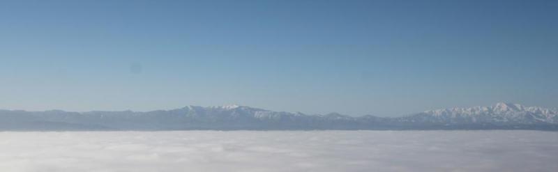 ●一昨日の雲海その3です 置賜盆地がすっぽりと雲海に包まれ周りの山々が衝立のように囲んでいます 初冬で山は雪を抱き広大な雲海のまわりを取り囲んでいます 普段なかなか見ることができない風景です 両手を広げても救いきれないほどの広い置賜盆地を独り占めできそうな素晴らしい風景です
