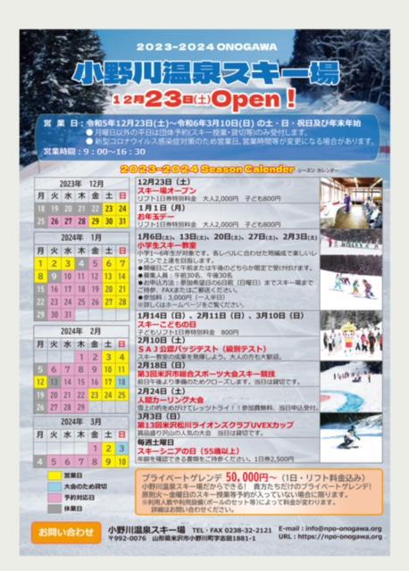 小野川温泉スキー場が12月23日(土)にオープンします。雪があればという前提が必要になりますが、年末年始、スキー場で楽しむことができたらいいな〜ゲレンデは一面だけでそんな難しいコースでなく、スキー、スノボもでき、ソリ遊びもできるゾーンがあるので、ファミリーやビギナー向けのスキー場です。スキーの後は温泉に入り、リフレッシュできるので、ぜひ、気軽に遊びにいらしてください〜 【公式】小野川温泉スキー場 | 【公式】小野川温泉スキー場 米沢の奥座敷、小野川温泉のスキー場へ (npo-onogawa.org)