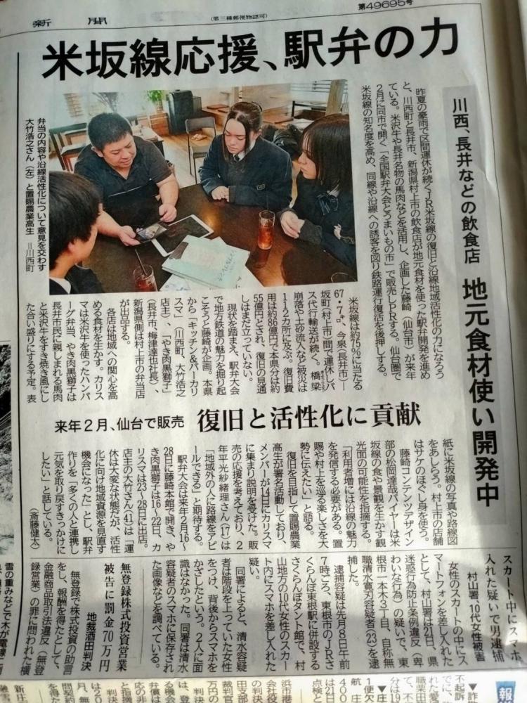 年末の山形新聞にうれしい記事が掲載されました。「米坂線応援、駅弁の力」というタイトルで掲載された記事には、町内のレストラン「カリスマ」店主大竹浩之さんが、置賜農業高校生に地元食材を活用した駅弁を開発し、来年2月16日から28日まで仙台市の藤崎デパートで開催される駅弁大会に出品する、という内容が載っていました。置農生も開発ばかりでなく、販売や宣伝にも一役買う覚悟でだとのこと。この駅弁が話題になり、米坂線応援の声が拡大することを祈ります。