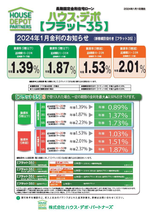 ●ハウス・デポ【フラット35】と【フラット35S】の2024年1月の金利情報
