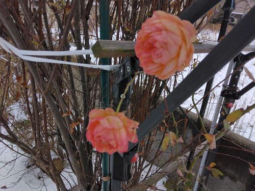 (1/9の休み中の記録、回想で書いています) 昨日の積もった雪も解け始めて、昼には、積雪深1pまでに・・・ 午前中、お茶タイム後に庭をグル〜と一周〜♪何とバラが開花していました! 庭は、こんな感じです〜 ↓じーじが、変なものを置いています!効果ありかな??少しでも早く雪が消えるように・・・なんてね。 ↓家の前はほとんどなくなりました! 我庭のお気に入りのクレマチス”火炎”長年頑張って咲き続けてくれましたがそろそろ新しい子にバトンタッチ!新たな苗を購入はしてみましたが、成長するまでちょっと時間がかかりそう?