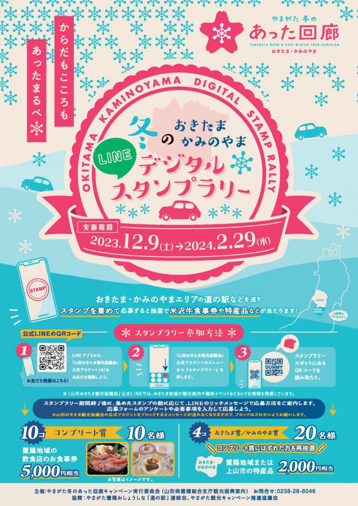 おきたま・かみのやまエリアの道の駅などを巡り、スタンプを集めて応募すると抽選で米沢牛食事券や特産品などが当たります!この機会にぜひ、冬のおきたま・かみのやまにお越しください! ◇実施期間:2023年12月9日〜2024年2月29日(木) ◇スタンプラリー参加方法@LINEアプリから、「山形おきたま観光協議会」公式アカウントをお友だち登録しよう。A「山形おきたま観光協議会」公式アカウントのメニューから『スタンプラリー』を押します。BスタンプラリースポットにあるQRコードを読み取ろう。Cスタンプラリー期間終了後、集めたスタンプの数に応じて、LINEのリッチメッセージで応募方法をご案内します。応募フォームのアンケートや必要事項を入力して応募しよう。※「山形おきたま観光協議会」公式アカウントをブロックするとメッセージが送れなくなりますので、ブロックはされないようお願いします。 ◇コンプリート賞(スタンプ10個)・置賜地域の飲食店のお食事券 5,000円相当・・・10名様 ◇おきたま賞/かみのやま賞(スタンプ4個)※コンプリート賞にはずれた方も再抽選!・置賜地域または上山市の特産品 2,000円相当・・・20名様 ◇スタンプ設置施設@道の駅米沢A道の駅田沢 なごみの郷B道の駅川のみなと長井Cicho cafe(いちょうカフェ)D道の駅たかはた まほろばステーションEかわにし森のマルシェF道の駅白い森おぐに ぶな茶屋G道の駅白鷹ヤナ公園 最上川あゆとぴあH道の駅いいで めざみの里観光物産館Iかみのやま温泉観光案内所 ◇詳しくは「やまがた冬のあった回廊ホームページ」をご覧ください。 【お問い合わせ】やまがた冬のあった回廊キャンペーン実行委員会       (置賜総合支庁観光振興室内)        TEL:0238-26-6046