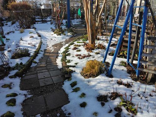 (1/19ブログ休み中の記録、回想で書いています) 今朝は、珍しく靄(もや)が!まもなく日も射してきて・・・今日は一日晴れ予報〜雪も昼で積雪深が0cmになりました! ↓朝、じーじが火炎(クレマチス)の植栽を始めたので庭をぐる〜と。 ↓ロックガーデンはまだ雪の中・・・ もう水仙の芽が出ています!球根も出ていいのかどうか迷いますネ。こんなに雪が少ないと花数が心配です。 “アーティチョーク”元気に育っています〜でも、昨年は咲かなかったです。 ↓クリスマスローズにも日差しが・・・