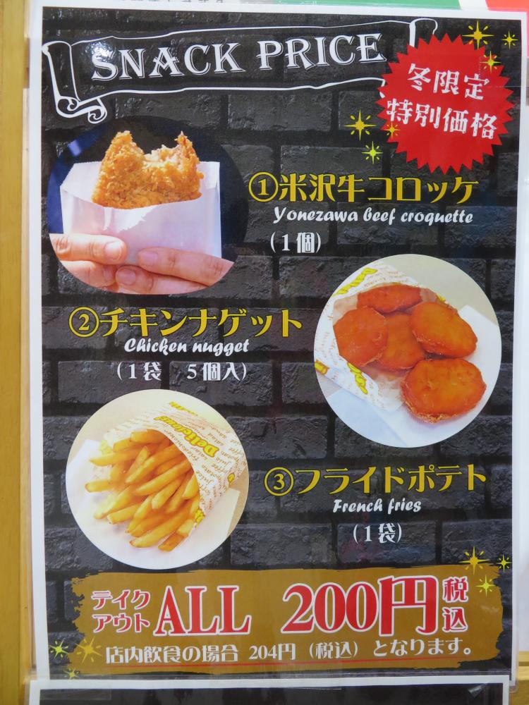 今年もレストラン縄文に冬限定特別価格のテイクアウトメニューが登場しました!!@米沢牛コロッケ 1個Aチキンナゲット 1袋5個入Bフライドポテト 1袋すべて税込価格200円です♪(店内飲食の場合、税込価格204円)アツアツの揚げたてを食べて、寒い冬を乗り切りましょう!!