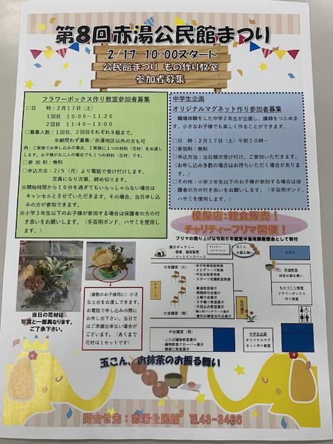 2月17日(土)赤湯公民館まつりを開催します。「フラワーボックス作り教室」と「オリジナルマグネット作り教室」では参加者を募集します。詳しくは赤湯地区全戸配布の公民館だより2/1号をご覧下さい。または、えくぼプラザ内のポスターをご覧下さい。※またはこの画像をご覧下さい。