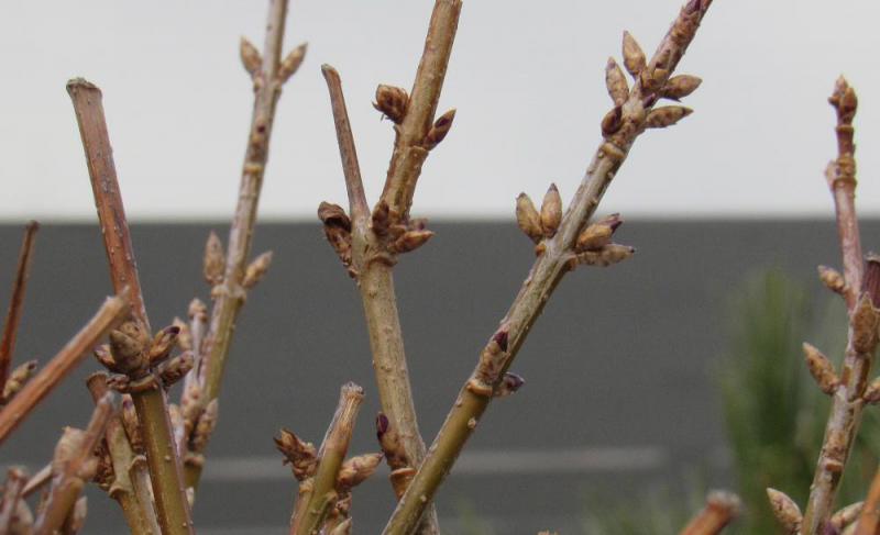 ●今日の新芽はレンギョウです 春一番に黄色の花をつけて春の訪れを告げてくれる花で道々の傍に咲いている花ですがまだまだつぼみは固くあの黄色の花を感じ取ることができません